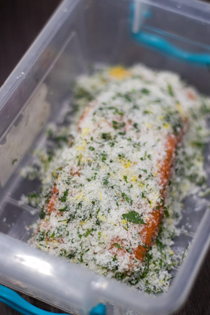 1. Z lososa sundejte kůži a pořádně ho papírovými utěrkami osušte. Smíchejte směs soli, cukru, citronové kůry a bylinek. Originální Gravlax je ochucen jen koprem, další bylinky a citronová kůra dodají ale další zajímavou chuť. Na dno nádoby dejte část směsi, přidejte lososa a zasypte ho zbytek směsi. Lososa překryjte na dotyk fólií a zatižte třeba krabicí s mlékem. Lososa nechte marinovat 1-3 dny, poté ho omyjte od zbytků směsi, osušte a těsně před podáváním nakrájejte na tenké plátky. Pro nejlepší konzistenci a chuť doporučuji marinovat 2 dny, pak je losos úplně delikátní ❤️.