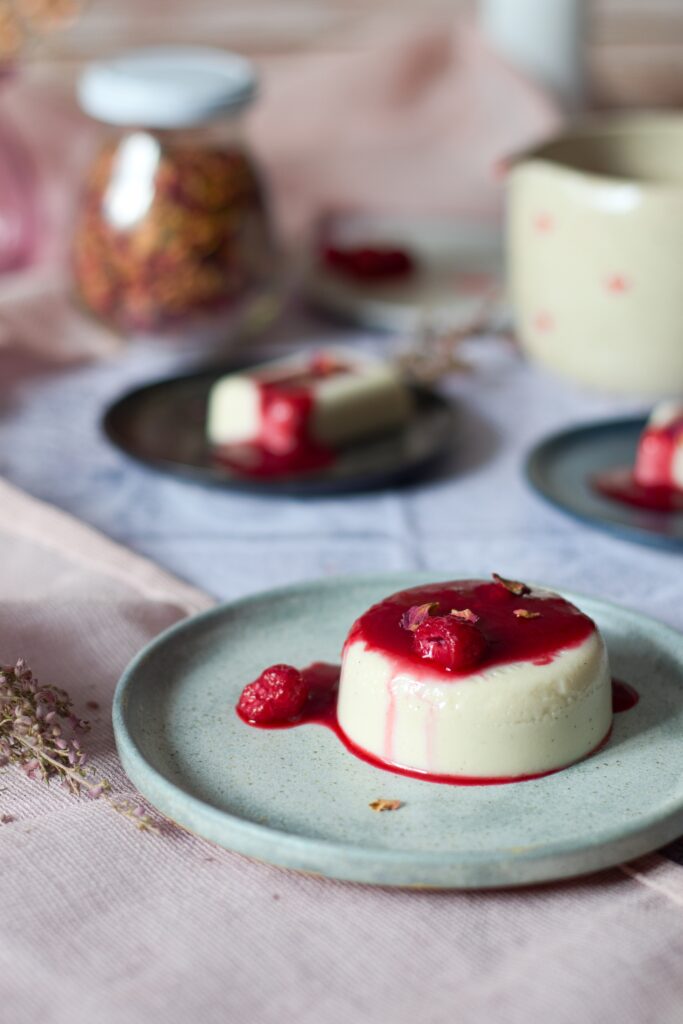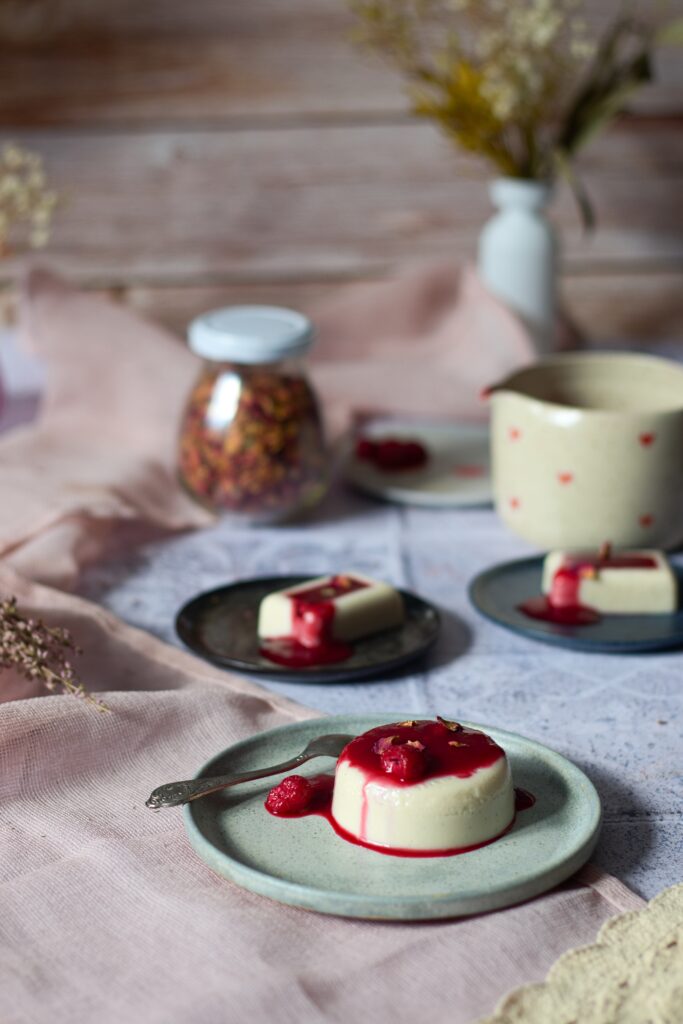 Kešu Panna cotta s malinami, malinová omáčka, veganská panna cotta s kešu a agarem