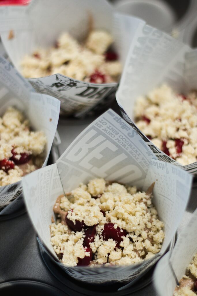 4. Do připravených košíčků dejte lžíci těsta, řádnou porci pokrájených třešní či višní a navrstvěte další dávkou těsta. Vršek opět ozdobte višněmi/třešněmi a nakonec pořádnou dávkou drobenky. U ovoce záměrně nepíšu množství, protože je na vás, kolik ho máte rádi. Každopádně čím více, tím lépe.